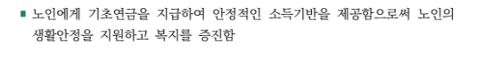 - 생활이 어려운 어르신의 안정적 노후를 위한 사회보장제도로, 국가 세금으로 운영됩니다.