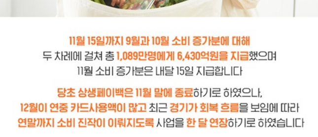 정부는 상생페이백 참여규모와 지역경제 활성화 효과를 고려해 12월 소비 증가분까지 포함하는 방안을 최종 확정했습니다. 연장에 따라 12월 소비도 소비환급 대상으로 포함되며 내년 1월 15일경 온누리상품권 환급이 지급될 예정입니다.