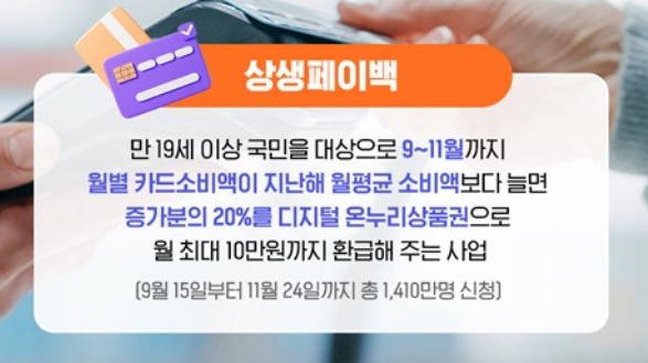 상생페이백은 정부가 추진하는 대표적인 정부 소비지원금 정책으로, 올해 9~11월 시행 후 높은 참여율을 바탕으로 12월까지 한 달 연장되었습니다. 상생페이백은 지난해 월평균 대비 증가한 개인별 카드 사용액의 20%를 소비환급 방식으로 돌려주는 구조이며, 환급은 디지털 온누리상품권 환급 형태로 지급됩니다.