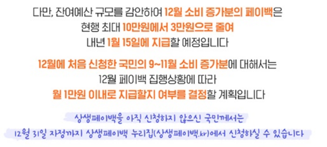 정부는 상생페이백 참여규모와 지역경제 활성화 효과를 고려해 12월 소비 증가분까지 포함하는 방안을 최종 확정했습니다. 연장에 따라 12월 소비도 소비환급 대상으로 포함되며 내년 1월 15일경 온누리상품권 환급이 지급될 예정입니다.