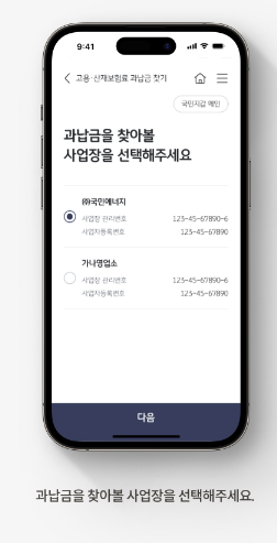 - 과납금을 찾아볼 사업장을 선택한 뒤 다음 버튼을 누릅니다.