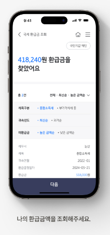 소득세, 법인세, 부가가치세, 종합부동산세, 상속세 등 국가로 귀속되는 주요 세목 모두 포함됩니다. - 본인 명의 환급금만 조회 가능