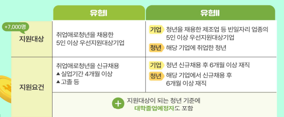 | 기업 요건 | 5인 이상 우선지원 대상 기업 (원칙) | 5인 이상 빈일자리 업종(제조업 등)의 우선지원 대상 기업 |