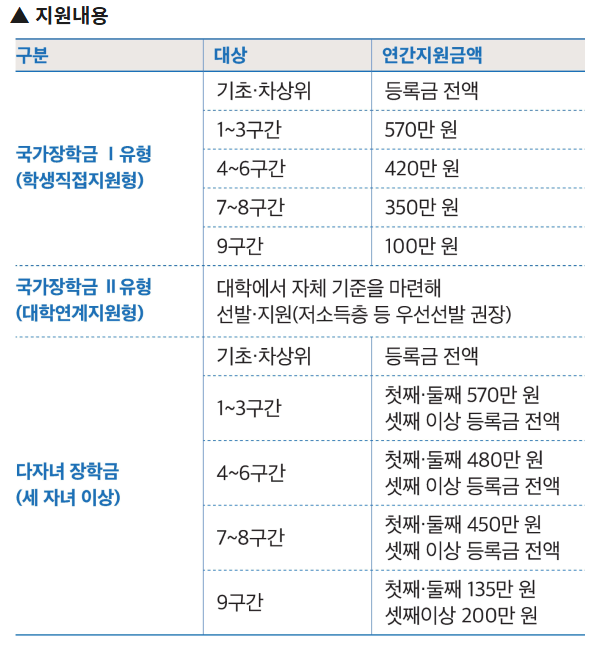 - 다자녀 국가장학금: 다자녀 가구(셋째 이상) 대학생에게 추가 지원
